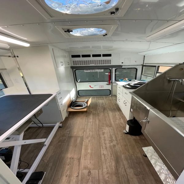 Did we mention our vans are self-sustaining? That's right! No need for us to hook-up to your garden hose or electric outlet; we'll bring the power, supplies, and our services to you. Our "pampering mobile pet facility" is fully insulated and climate controlled for the most comfortable atmosphere. With bright LED lighting, a fully adjustable water heater, and an overhead ventilation system; we make it easy and safe grooming your best friend. Our unique design keeps our lour equipment (vacuum system, blow dryer, etc.) in a separate room to keep those sensitive ears stress-free.
